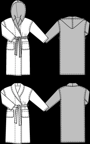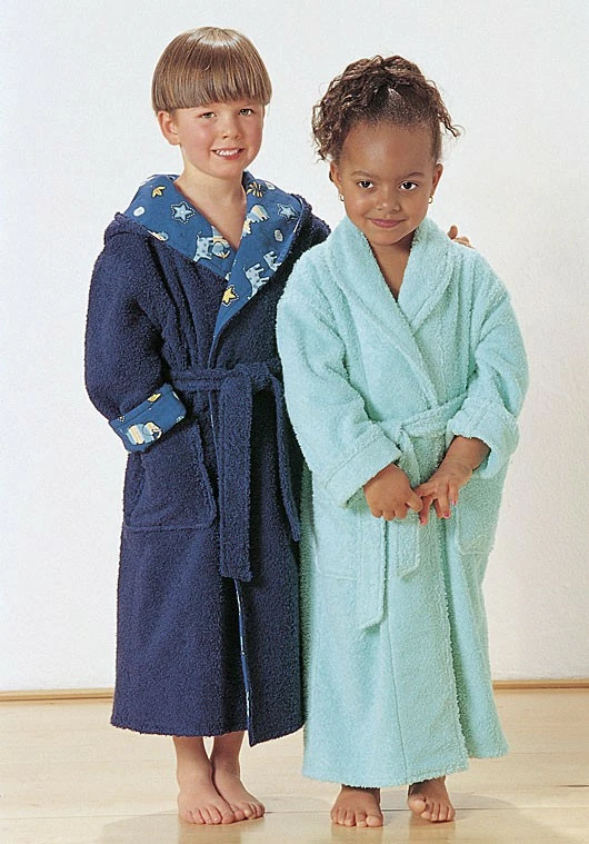 Bademantel, sehr weit. A mit Kapuze, aussen Frottee, innen Baumwollstoff. B mit Schalkragen.