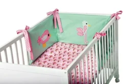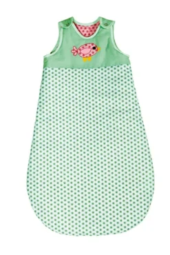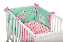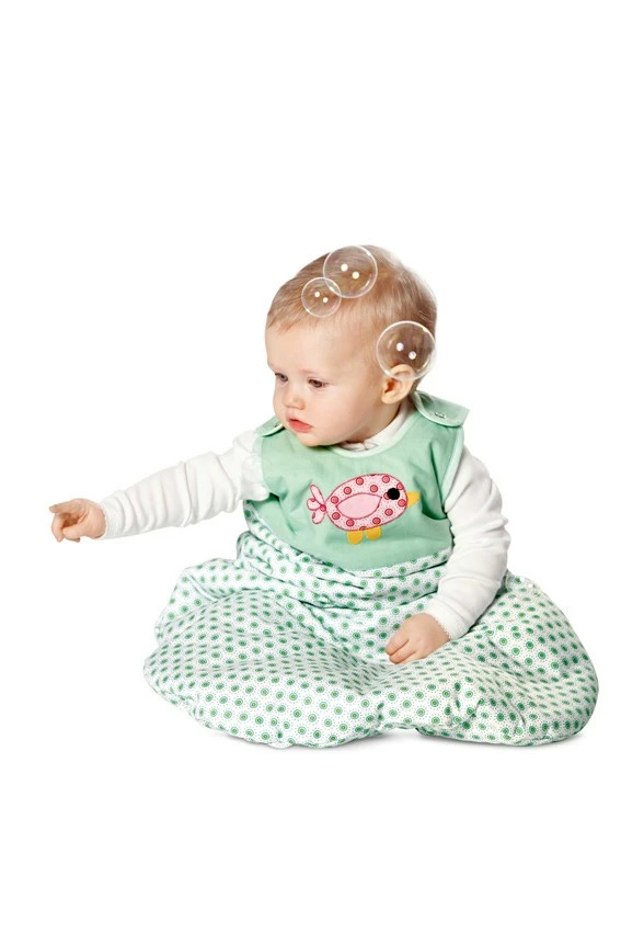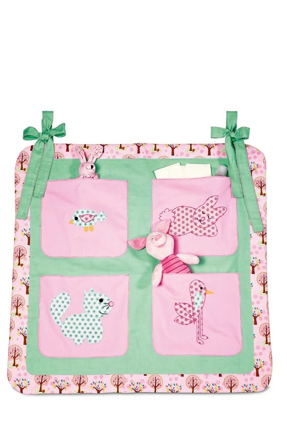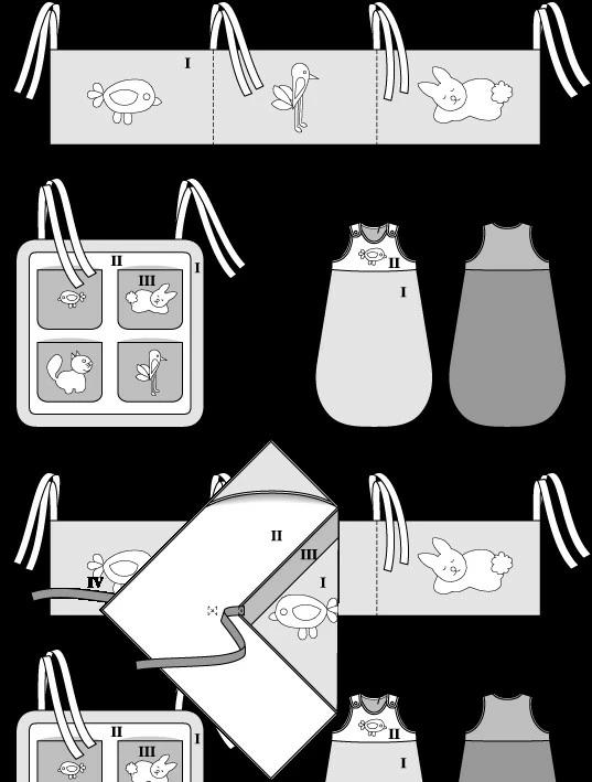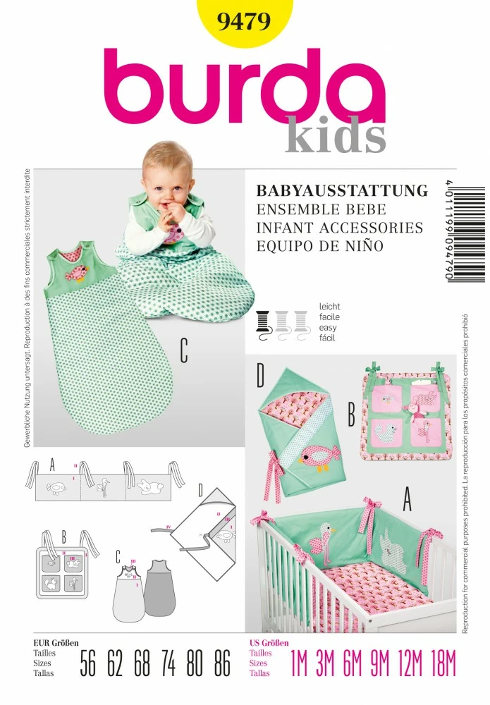Wohlfühloase für die Kleinen – weich, kuschelig, schön bunt und mit lustigen Applikationen verziert. Nestchen A wird am Gitterbettchen einfach festgebunden. Utensilo B hat vier Täschchen für viele nützliche Kleinigkeiten. Schlafsack C mit Schulterverschlüssen zum bequemen Einsteigen. Wickeltuch D mit Kapuze hält schön warm.